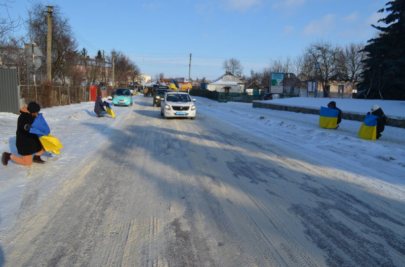 На світлинах видно, що у снігу, попри мороз, обабчі дороги, по якій їхав жалобний кортеж з тілом загиблого Захисника, стояли навколішках його земляки з синьо-жовтими знаменами.