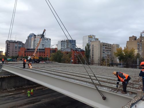 Цими вихідними підрядна організація здійснила монтаж 28 балок прогонової будови шляхопроводу. Сьогодні ж тривають роботи з монтажу плити незйомної опалубки. Це дасть можливість улаштувати монолітну плиту на шляхопроводі.