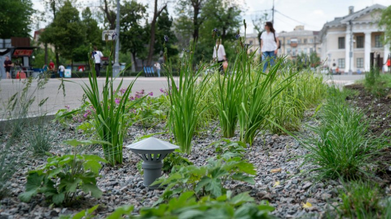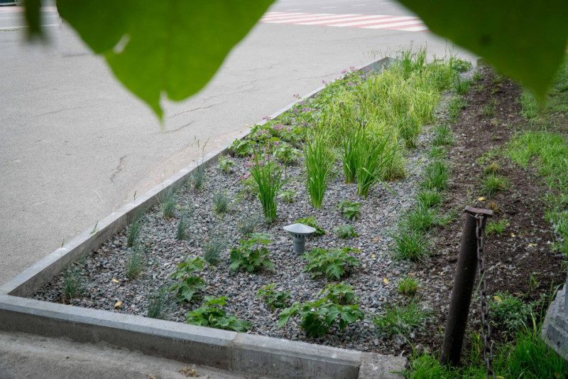 "Завдяки цьому під час зливи частину води забирає на себе саме він, а не зливостокова каналізація. Виглядає такий садок як заглиблена клумба, що оточена вологолюбними та стійкими до спеки багаторічними рослинами", — зазначив заступник голови КМДА з питань здійснення самоврядних повноважень Володимир Прокопів.