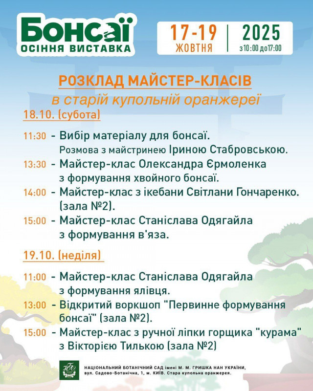 З 17 по 19 жовтня в Національному ботанічному саду імені М. Гришка відбудеться виставка «Бонсаї», де на вихідних гостей очікують насичені та пізнавальні майстер-класи майстрів.