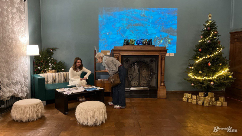 Завершує експозицію святкова фотозона з каміном, ялинкою з кульками, розписаними за мотивами творів Марії Примаченко та затишним книжковим куточком.