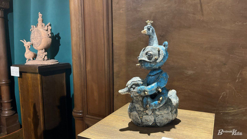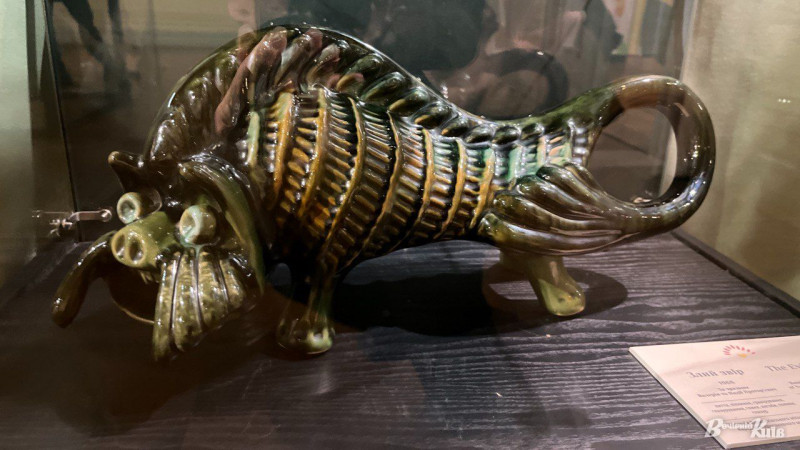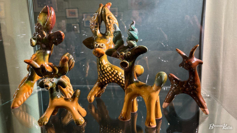 Тут же можна побачити яскраву кераміку сучасних майстрів. Роботи Неллі Ісупової впізнаються з першого погляду. В них фантазійно переплітаються чоловічки, риби, рослини, дерева та квіти.