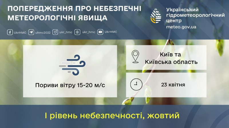 23 квітня по території Київської області та міста Києва очікуються пориви вітру 15–20 м/с, що відповідає І рівню небезпечності (жовтий).