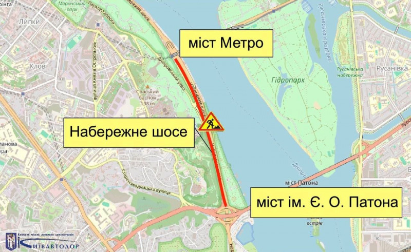 Як повідомили у КК «Київавтодор», фахівці ремонтуватимуть ділянку від мосту Метро до транспортної розв’язки мосту ім. Є. О. Патона.