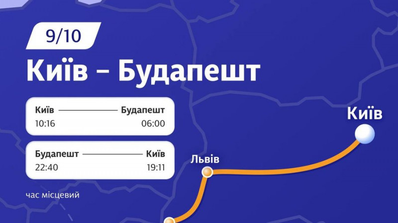У зворотному напрямку: відправлення з Будапешта о 22:40, прибуття до Києва о 19:11.