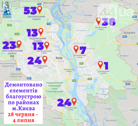 Лидирующие позиции по количеству демонтированных элементов занимают следующие районы Киева: