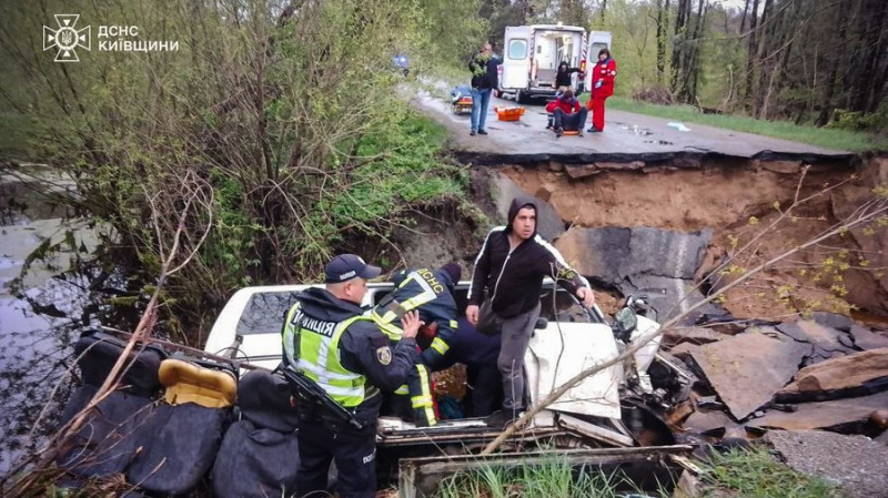 "Прибувши до місця події, рятувальники встановили, що на трасі Іванків-Радомишль, мікроавтобус віз людей на роботу в с. Пісківка, і провалився у провалля. В салоні знаходилось 9 пасажирів", — йдеться у повідомленні.
